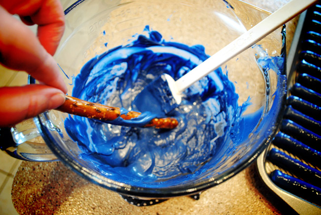 - I dip one end of the pretzel rod into the chocolate and use my little rubber spatula to coat the rest of the rod.